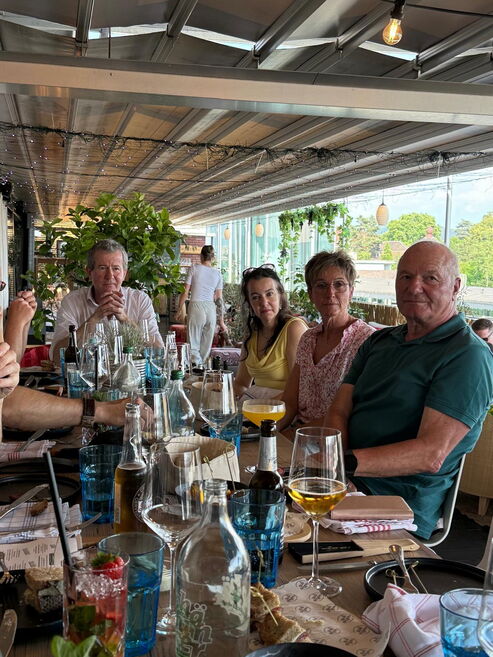 Oben angekommen, erwartete uns in der Rooftopbar des Kursaals eine gemütliche Tavolata mit wunderbarem Essen, guten Gesprächen und Blick über die Stadt. In dieser besonderen Atmosphäre verabschiedeten wir auch unsere liebe Mitarbeiterin Liliane Künzi, die sich aus gesundheitlichen Gründen vorerst vom Unterricht zurückzieht. Wir danken Liliane von Herzen für ihr langjähriges Engagement, ihre Herzlichkeit und all die schönen Tanzmomente, die sie uns geschenkt hat. ❤️